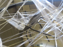 These site-specific drawings were produced using pallet wrap. They stretched over walls, floors and corridors, flowing between indoor & outdoor spaces and wrapping around objects in various rooms. Line, scale, space, light, dimension and distortion were considered.