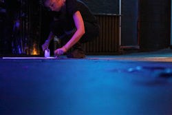 The location of my live artwork was on the theatre stage behind the ‘iron curtain’. I produced a large scale three dimensional drawing using a line like a trail of thought that can be seen as constant, concealed or fractured, depending on your viewpoint.